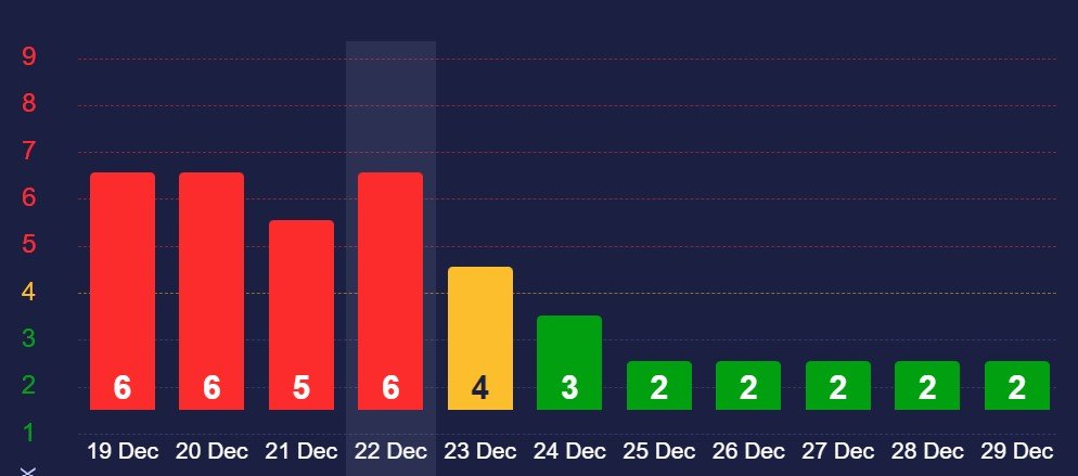 Prognozuojama, kad rytoj, gruodžio 23-ąją, magnetinė audra nuslops ir aktyvumas sieks keturis balus, o žiemos šventes pasitiksime ramaus magnetinio lauko fone.