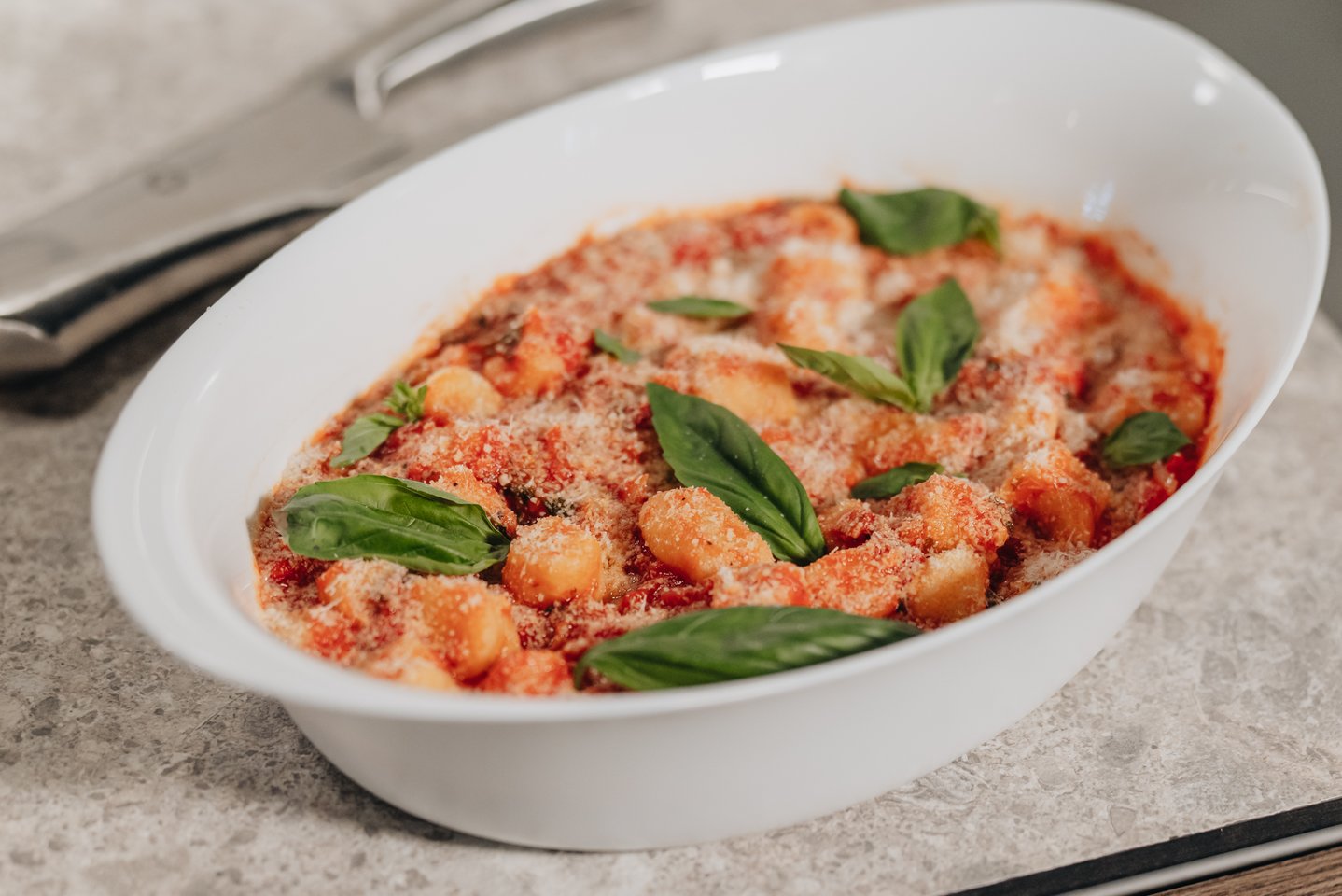 Išvirusius gnocchi sumaišykite su pomidorų padažu, ant viršaus pabarstykite tarkuoto parmezano sūrio, pagardinkite pipirais bei šviežiu baziliku.