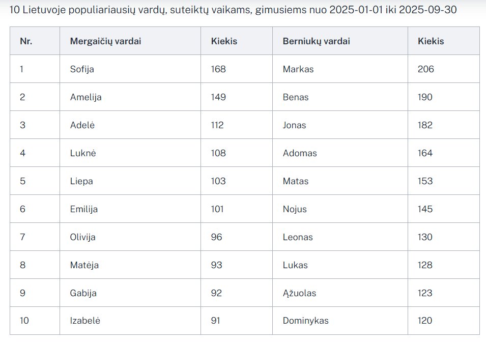 Pradėjus dairytis po naujai parengtą Registrų centro populiariausių vaikų vardų sąrašą, galima matyti, kad pirmąją vietą šiemet skynėsi vardas Sofija. Jis tėvų buvo suteiktas net 168 kartus.