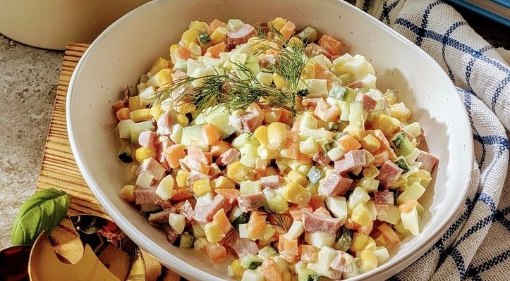 Į dubenį sudėkite visus ingredientus, dėkite majonezo, druskos ir pipirų. Išmaišykite.