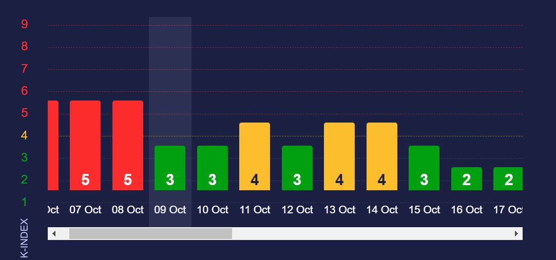 Duomenys rodo, kad spalio 11 dieną, trečiadienį, numatoma keturių balų stiprumo magnetinė audra. Ketvirtadienį magnetinio lauko aktyvumas bus mažesnis, tačiau spalio 13 ir 14 dienomis numatoma keturių balų stiprumo magnetinė audra.