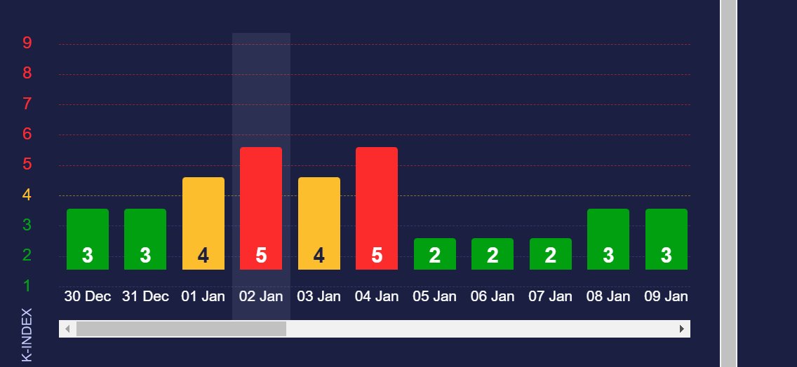 Prognozuojama, kad rytoj, trečiadienį, magnetinio lauko aktyvumas kiek nurims ir nukris iki keturių balų, tačiau ketvirtadienį, sausio 4-ąją, ir vėl atslinks penkių balų stiprumo magnetinė audra.