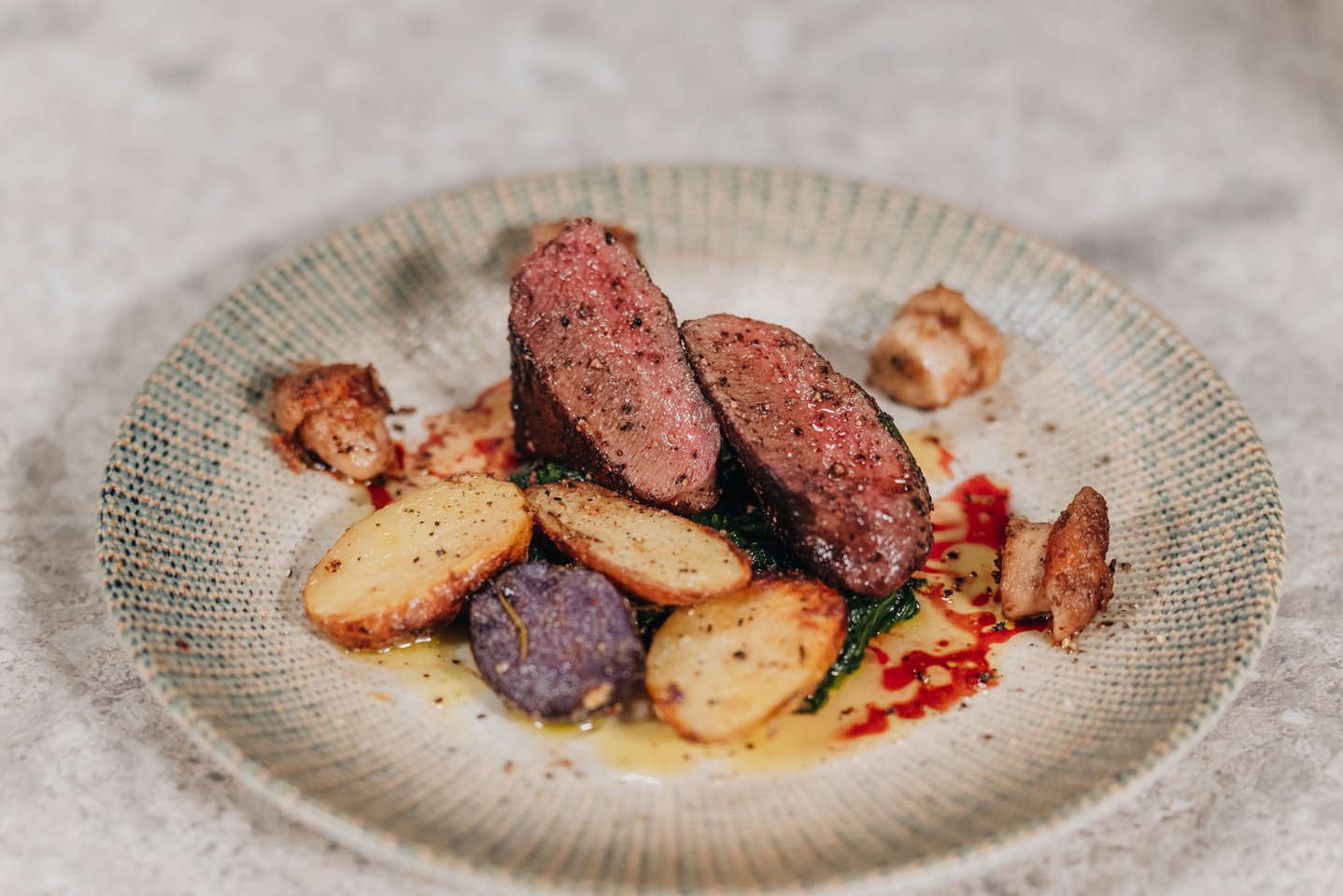 Stirnienos išpjova su keptais baravykais, špinatais svieste ir bulvėmis žolelių majoneze