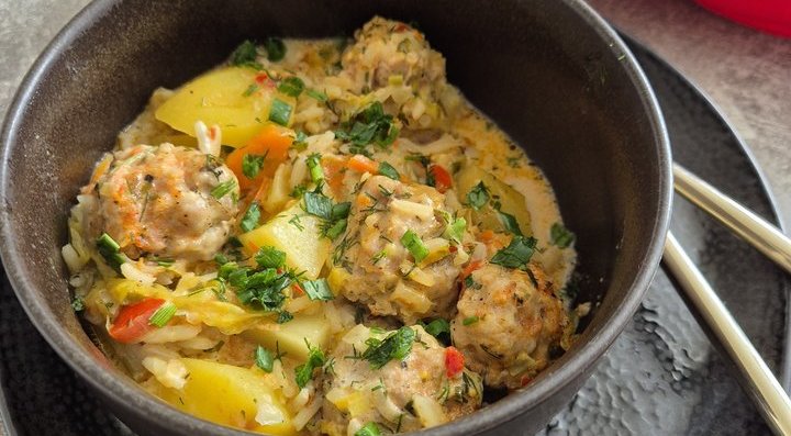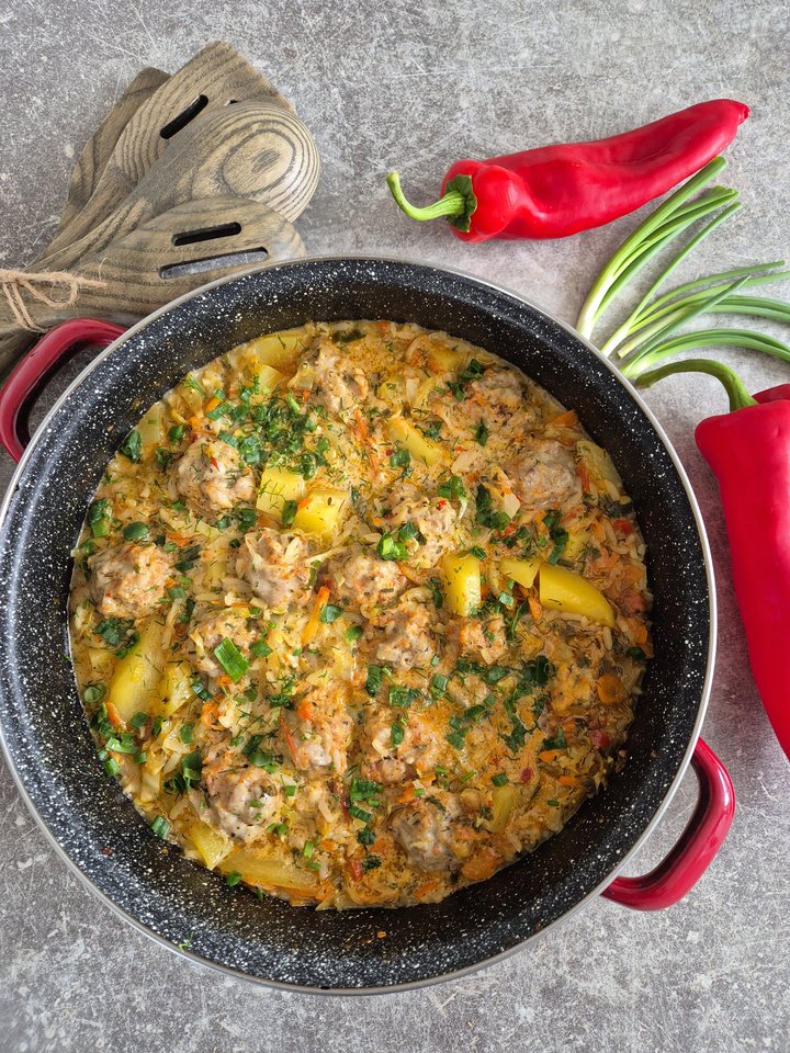 Į troškintuvą sudedame daržoves, mėsos kukulius, ryžius. Užpilame vandenį maišytą kartu su naminiu pomidorų padažu ir grietine.