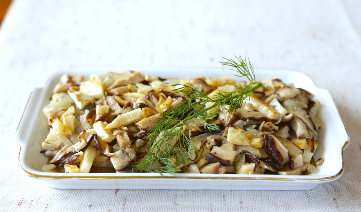 Silkės su salieru, pievagrybiais ir svogūnais receptas