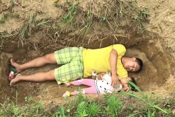 „Pear Video“ internetinėje svetainėje įkeltas vaizdo įrašas pasakoja apie šią tragišką šeimos istoriją. Tėtis su dukra Zhang Xinlei gulasi į kapavietę ir ten praleidžia kelias minutes. Mažajai mergaitei diagnozuota talasemija – paveldima kraujo liga. Zhangas ir jo šeima dukrelės gydymui jau išleido 13 tūkst. eurų, tačiau daugiau vaistams ir įvairioms procedūroms pinigų šeima nebeturi.