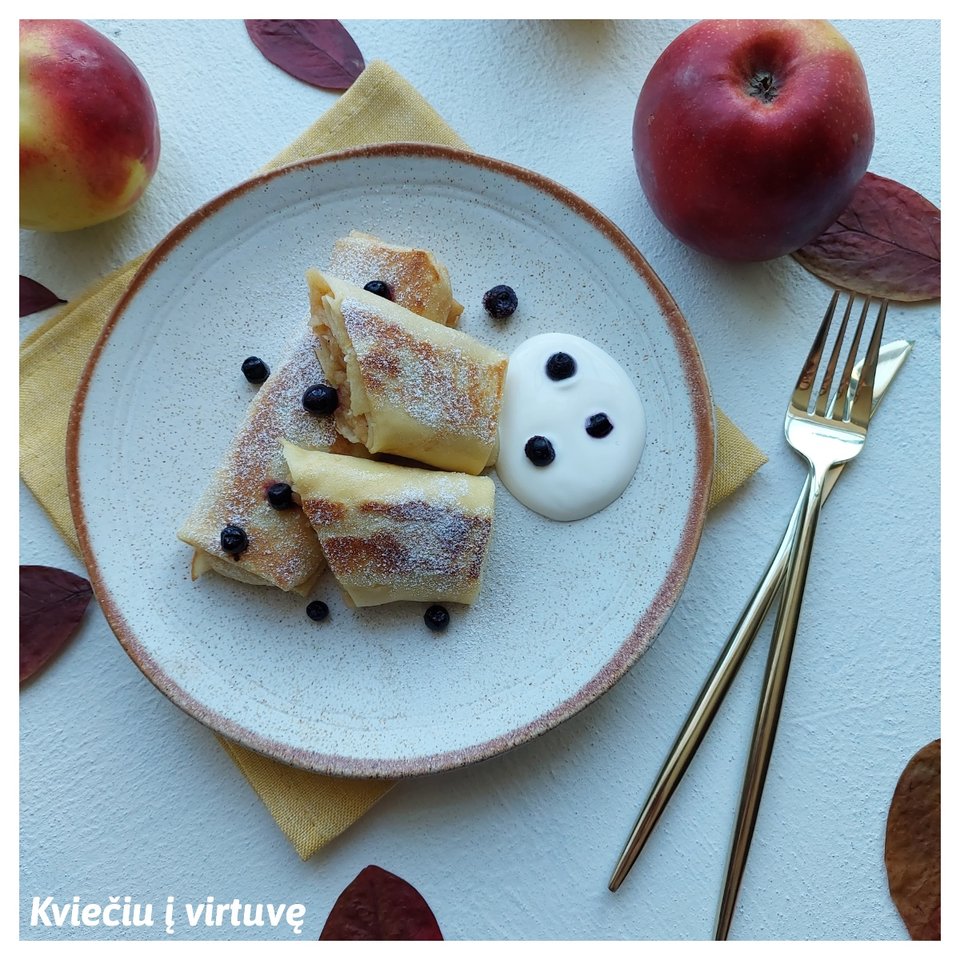 Įdarui skirtus obuolius nuplauname, nulupame ir sutarkuojame burokine tarka. Maišome su cukrumi ir cinamonu. Šio įdaro dedame ant lietinių, suvyniojame, kaip mums gražiau ar skaniau. Kepame su šlakeliu aliejaus, kol blyneliai gražiai apskrus.