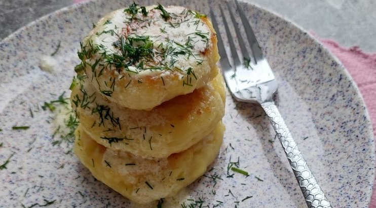 Porcijos 2. Užtruksite apie 20 min. Reikės: 400 g virtų bulvių; 4 v. š. varškės; 1 kiaušinis; 3 v. š. miltų; žiupsnis druskos; žiupsnis juodųjų pipirų; šlakelis aliejaus, kepimui.
