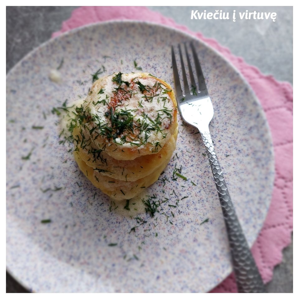 Padažui: 1 v. š. sviesto; 2 v. š. grietinės; žiupsnis druskos; žiupsnis muskato; 1 v. š. krapų smulkintų.