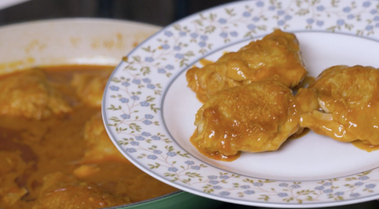 Sudėkite iškeptą vištieną, sumažinkite kaitrą iki minimalios, uždenkite keptuvę ir palikite troškintis, kol mėsa bus minkšta.