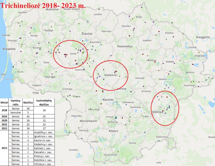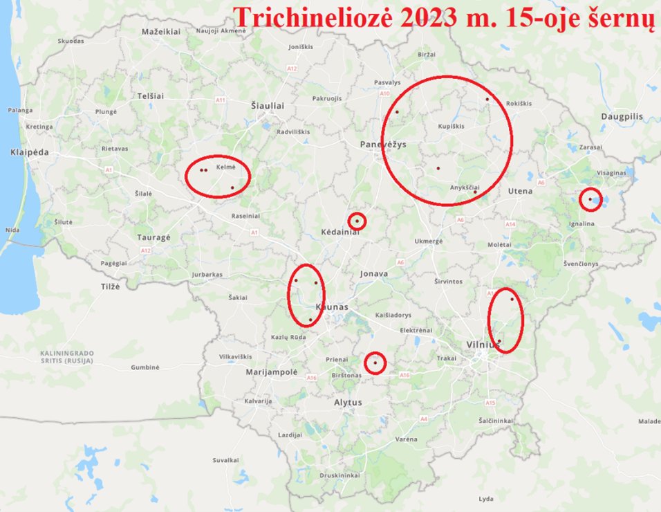 Valstybinės maisto ir veterinarijos tarnybos duomenimis, 2023 m. atlikus Lietuvoje sumedžiotų šernų trichineliozės laboratorinius tyrimus, net 15 šiais parazitais užsikrėtusių šernų. Trichineliozės paplitimas šernuose, 2023 metais (žr. Pav. 2).