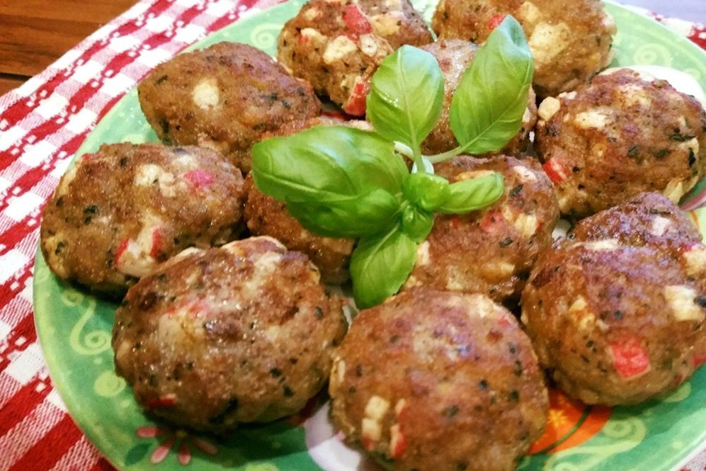 0.5 kg.malto kiaulienos ir jautienos faršo arba kokį mėgstate), 1 kiaušinio, 5 vnt.krabų lazdelių, 2 - 3 piene mirkyto batono, maltos mėsos prieskonių, smulkiai pjaustyto svogūno, druskos, žalumos ( aš naudojau džiovintus špinatus), džiūvesėlių ( paniravimui), aliejaus kepimui