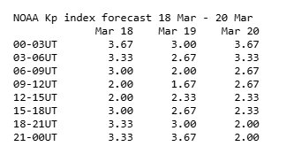 Rytoj, kovo 19 d., po vidurnakčio ir vėl artėjant vidurnakčiui aktyvumas bus kiek didesnis, kils iki 3 ir daugiau balų, vis tik dienos metu laikysis apie 2 balus, su nežymiais sumažėjimais (iki 1,67) ir padidėjimais (2,67).