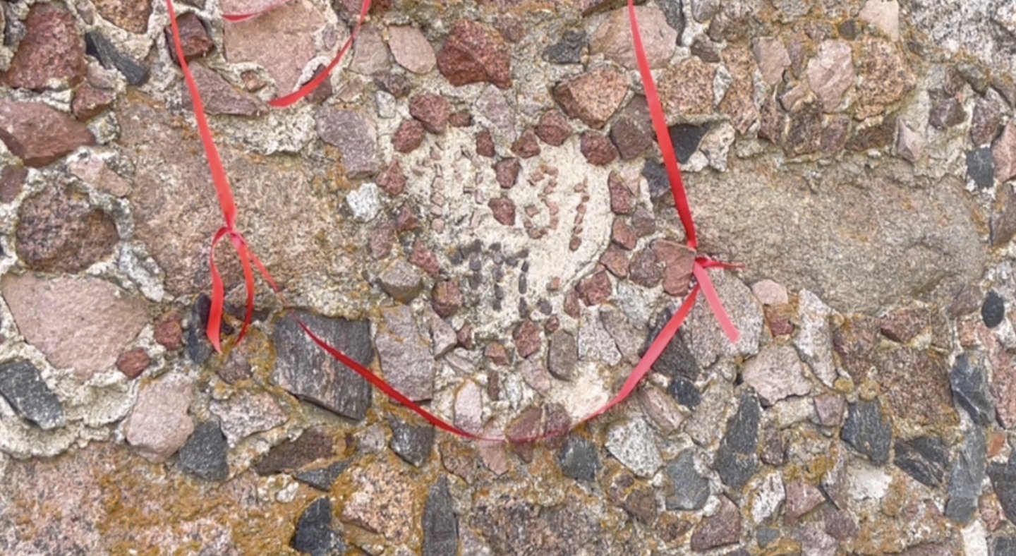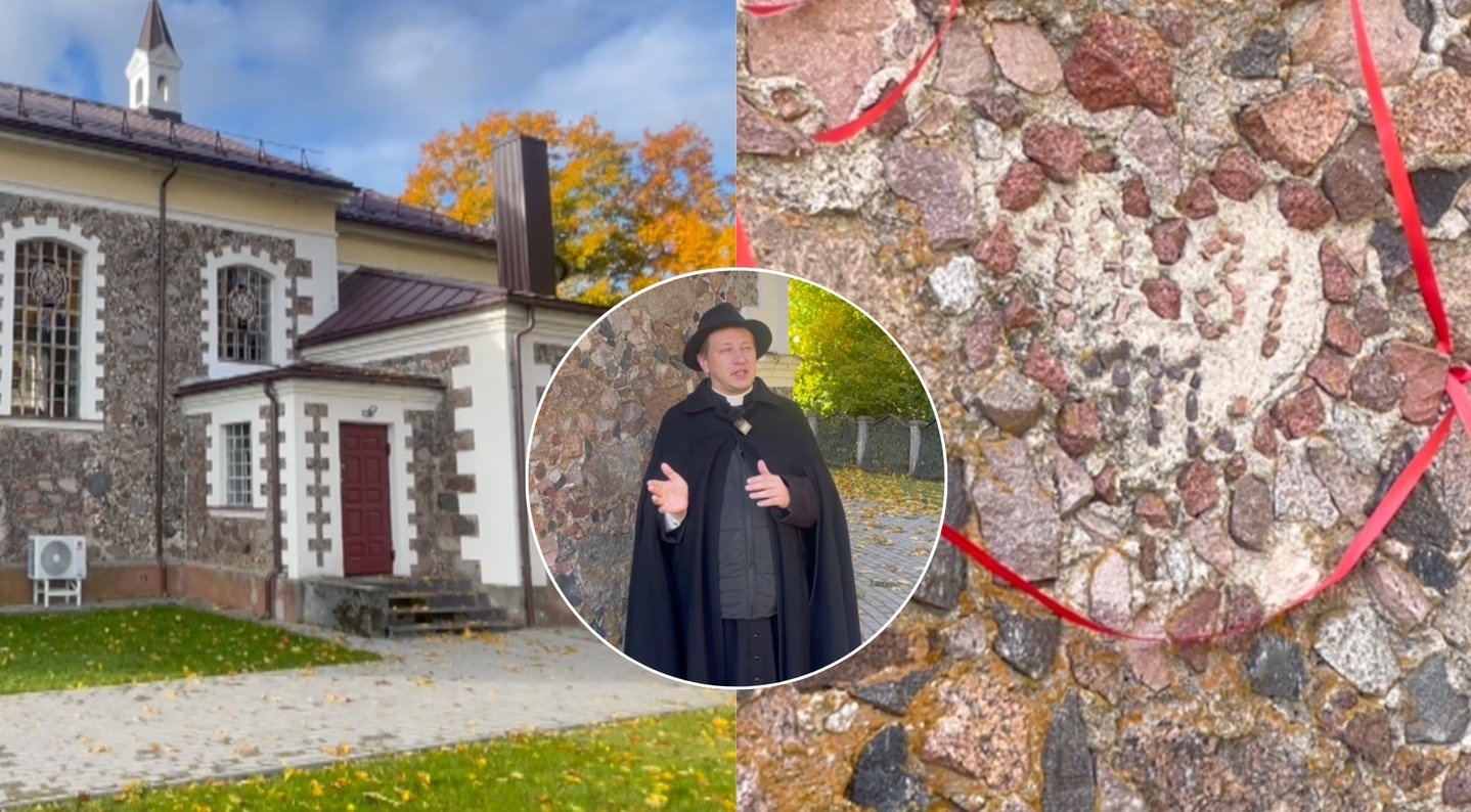 Alytaus Švento Liudviuko bažnyčios klebonas Marius Talutis kaspinu apjuosia ant bažnyčios išorinės sienos atrastą širdelę. Sako ją čia pastebėjęs labai netikėtai – atėjęs pasimelsti prie šalia bažnyčios palaidotų dviejų kunigų kankinių.