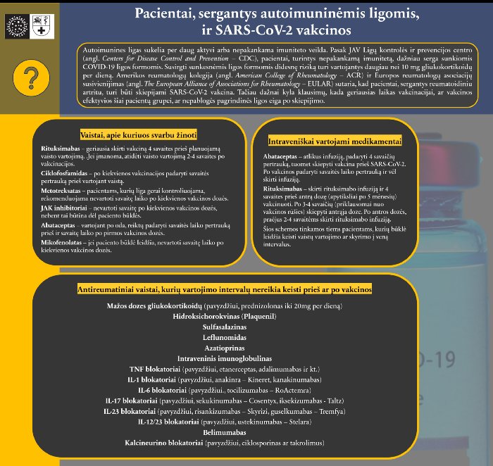 Taip pat svarbu žinoti, kad kai kurie medikamentai turi būti derinami su SARS-CoV-2 vakcina, jeigu tik leidžia pacientų būklė. Amerikos reumatologų kolegijos rekomendacijos: