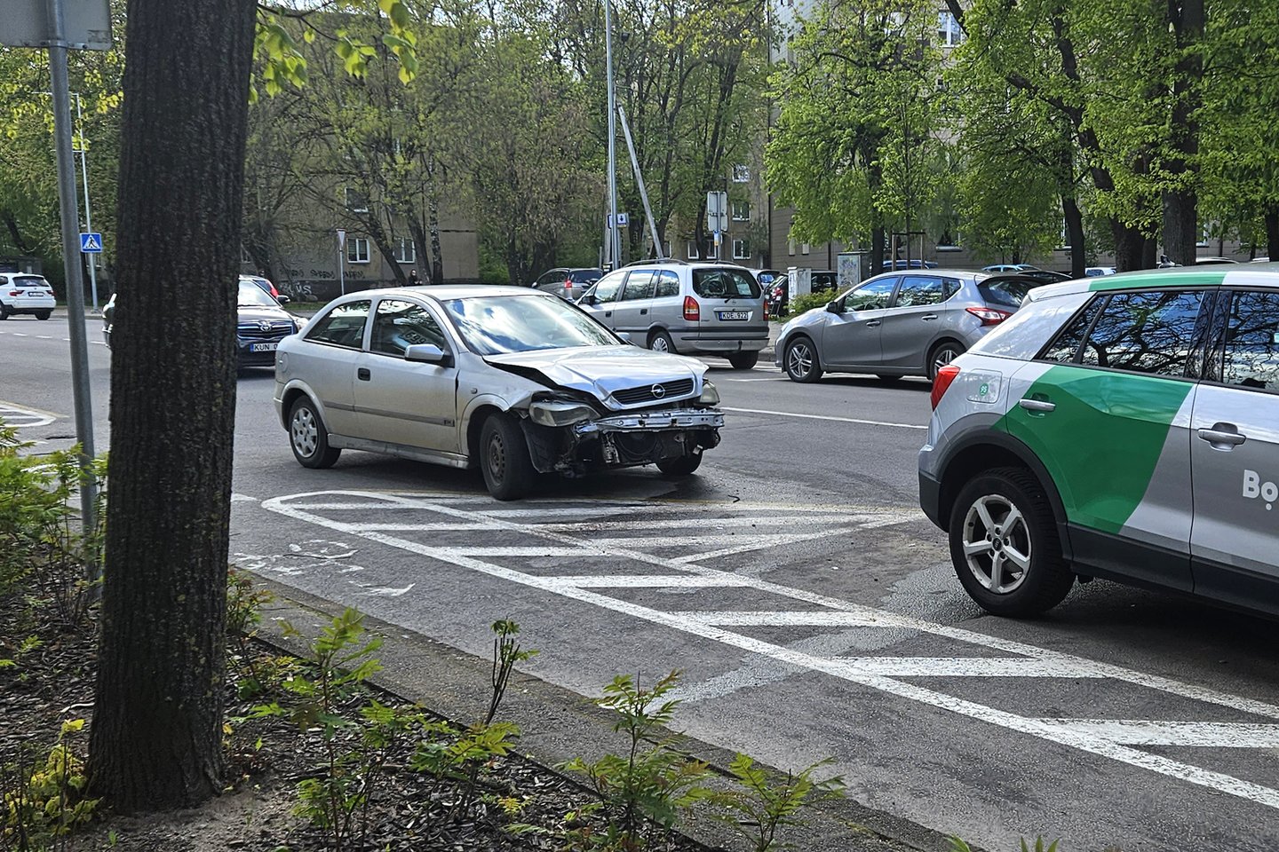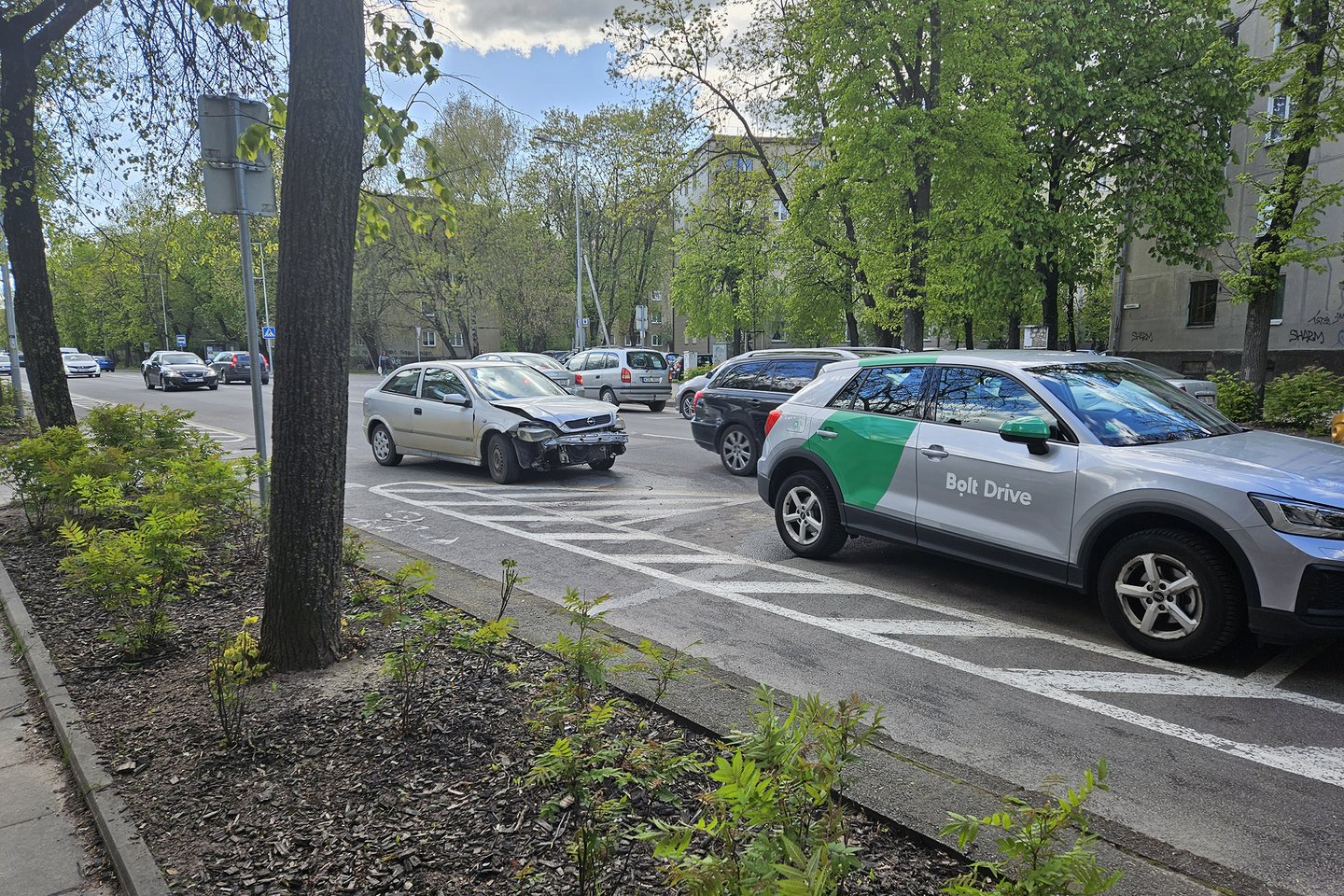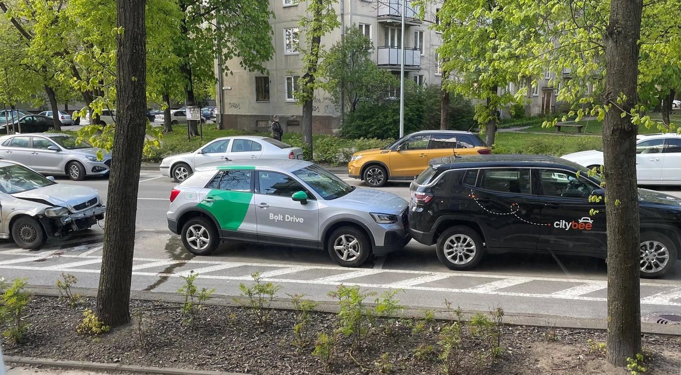 Vilniuje, Naugarduko g. įvyko avarija – automobilis „Opel“ rėžėsi į priparkuotą „Bolt Drive“, o šis stuktelėjo į stovintį „CityBee“ automobilį.