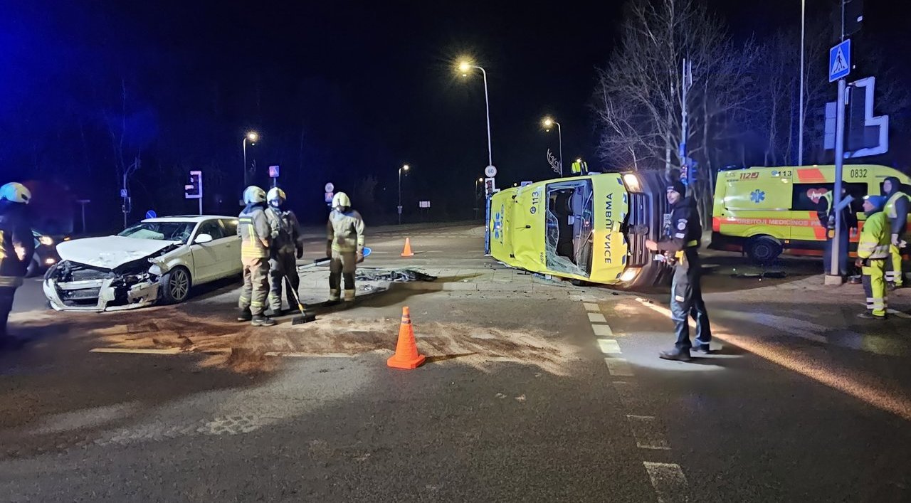 Įvykio aplinkybės tiriamos – galimai GMP automobilis su švyturėliais važiavo degant raudonam signalui ir susidūrus su automobiliu „Audi“ apvirto.