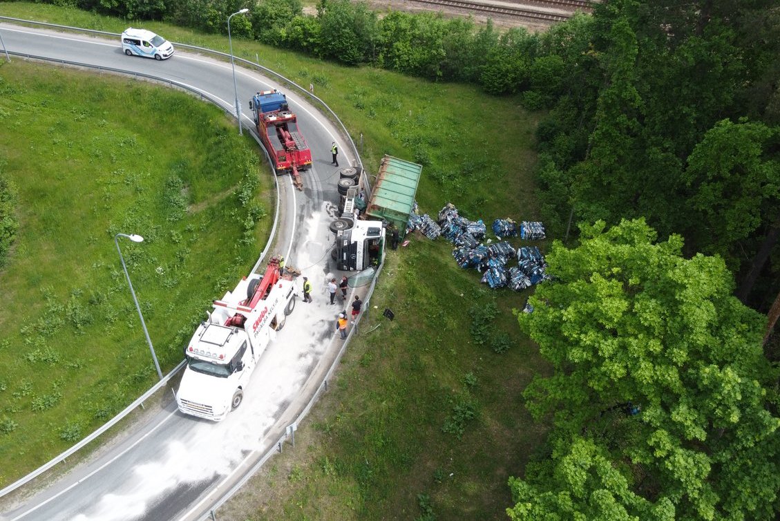 Apvirtus „Mercedes-Benz“ markės sunkvežiumui, iškrito ir vežamas krovinys.