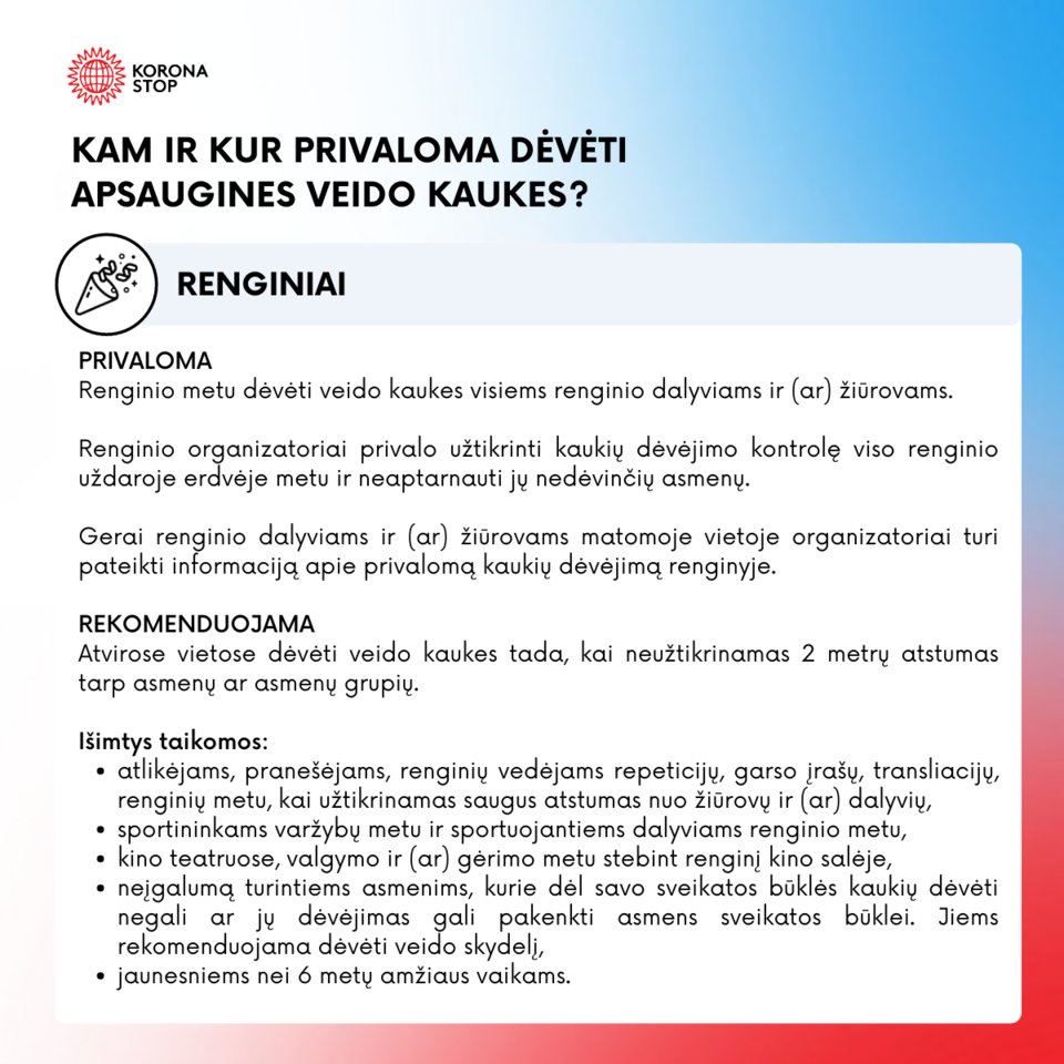 Primename, kad nuo spalio 1 d. nosį ir burną dengiančių apsaugos priemonių dėvėjimas (kaukių, respiratorių ar kt.) yra privalomas visose uždarose erdvėse.