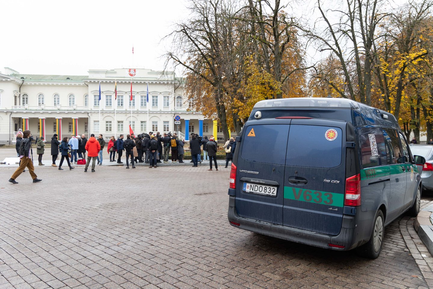 Robertui Kaunui susitinkant su prezidentu protesto organizatoriai prie prezidentūros sukvietė žmones. Tik panašu, kad ne visi čia dėl to susirinko. Mat šalia prezidentūros kasdien stovi žmogus, apsigaubęs kultūros protesto vėliava. Kadangi socdemai ir kultūros ministro iki šiol neturi. Tad persipynė du protestai.