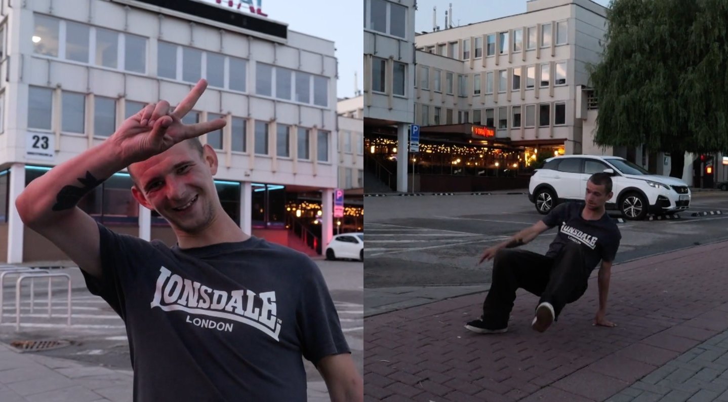 Kad jau kamera įjungta, jaunuolis nusprendžia dar ir vikrumą pademonstruoti. Lengvas apšilimas ir vyras ore atlieka salto – tiesa, netobulai. Gerai atlikti greičiausiai pamaišė apykojė.