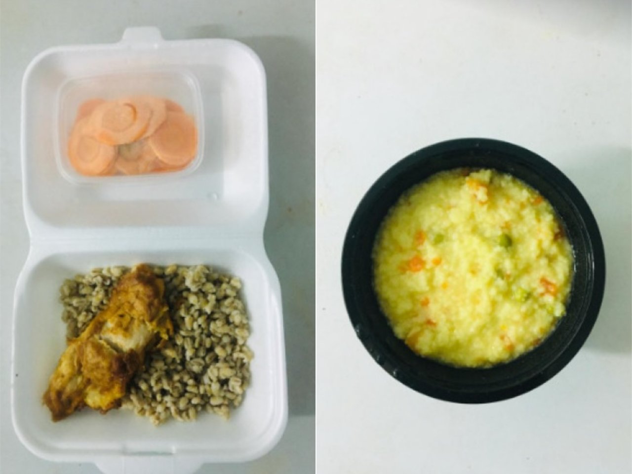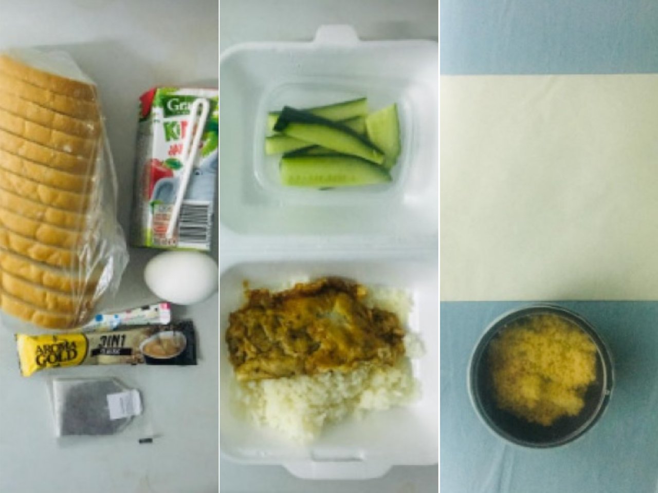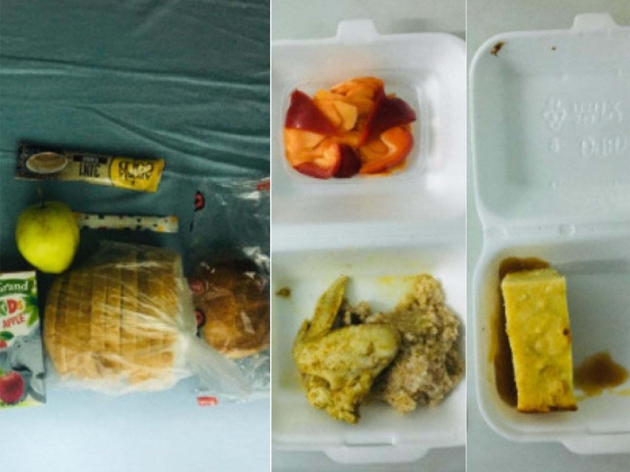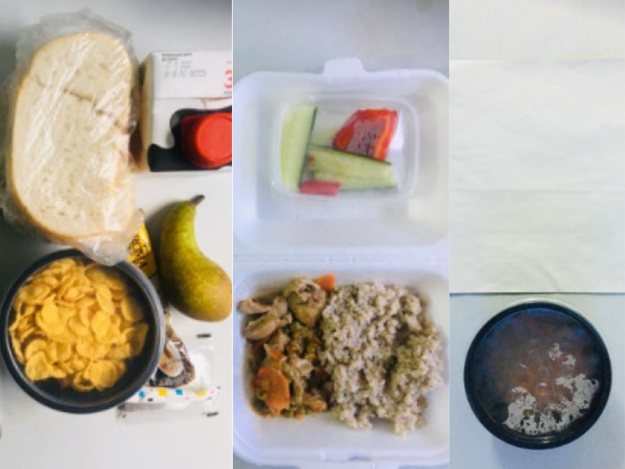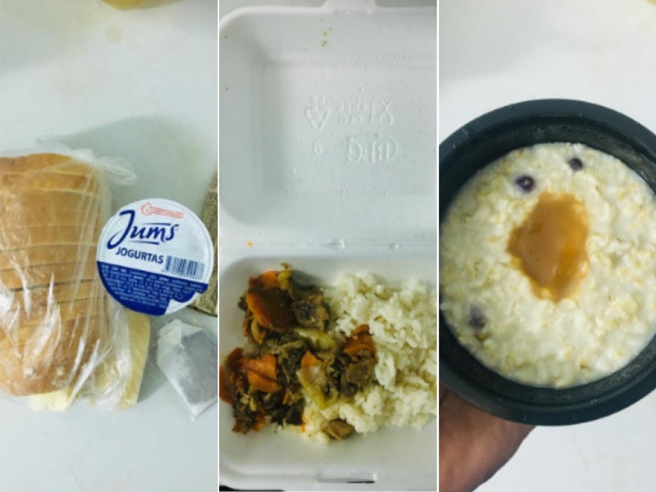 Toliau pateikiami patiekalai birželio 1-ajai. Pusryčiams – pusę pigiausio batono, vienas kiaušinis, vienas vaikiškas sulčių pakelis, arbatos pakelis, kavos 3 in 1 ir cukraus pakelis. Pietums – 100 gramų ryžių, 50 gramų vištienos bei penkios skiltelės agurko. Vyras prie nuotraukos prirašė, kad tokio kiekio vienam asmeniui neužtenka, o ryžiai neišvirti. Vakarienei – košė, kurios kiekis itin negausus.