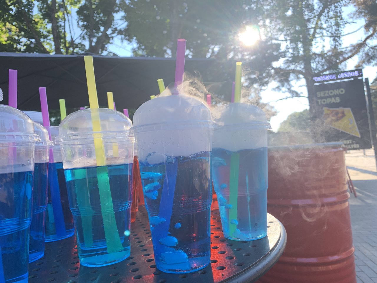 „Tai yra sausas ledas. Jis iškelia dūmus ir duoda truputį gazo. Gėrimas gaminamas iš natūralių sirupų, burnos nedažo ir yra dviejų rūšių – braškių ir gumos skonio“, – tv3.lt pasakoja Lučiana.