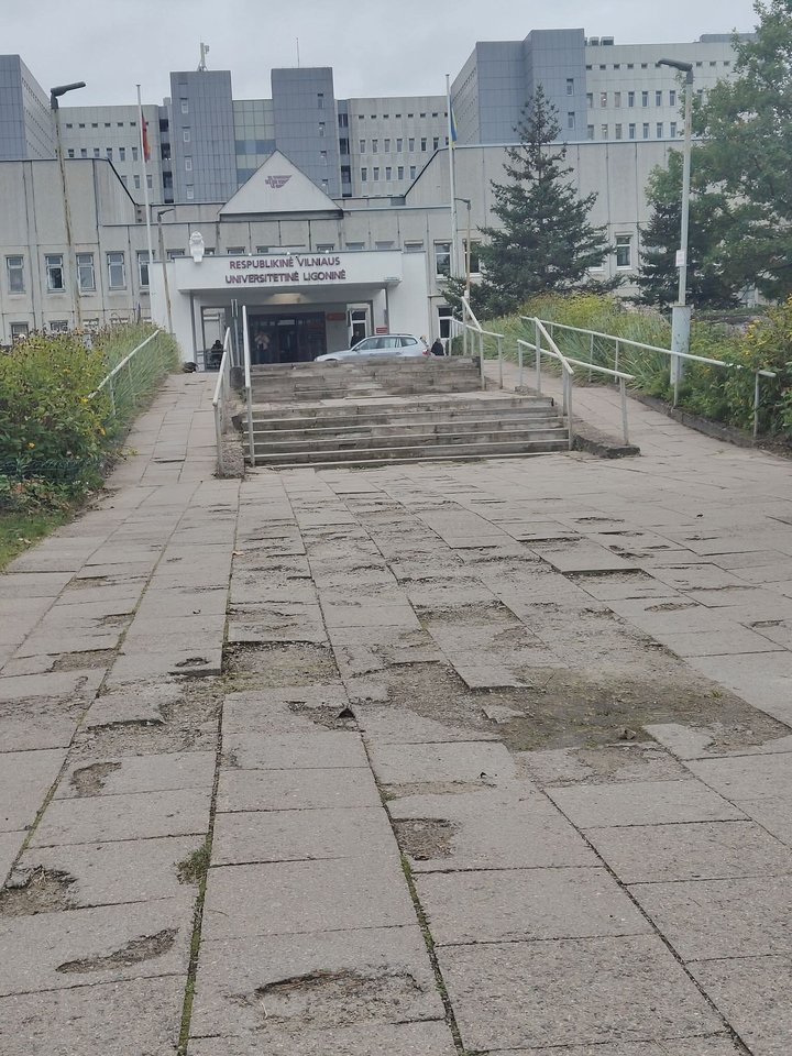Prie respublikinės Vilniaus universitetinė ligoninės (RVUL) priėjimas tarsi duobėmis grįstas. Keli tūkstančiai žmonių pastebėjo prastos būklės infrastruktūrą šalia ligoninės.