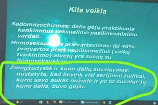 Kaip skelbta, Telšių Žemaitės gimnazijos vadovybė tikrina pranešimus, kad per tikybos pamoką vaikams buvo teikiama homofobiška informacija apie tarp homoseksualų esą paplitusius prievartavimo ir kanibalizmo atvejus. Nuotraukomis, kurioje matyti pamokoje rodytos skaidrės, „Facebook“ socialiniame tinkle pasidalino gimnazijos abiturientė.