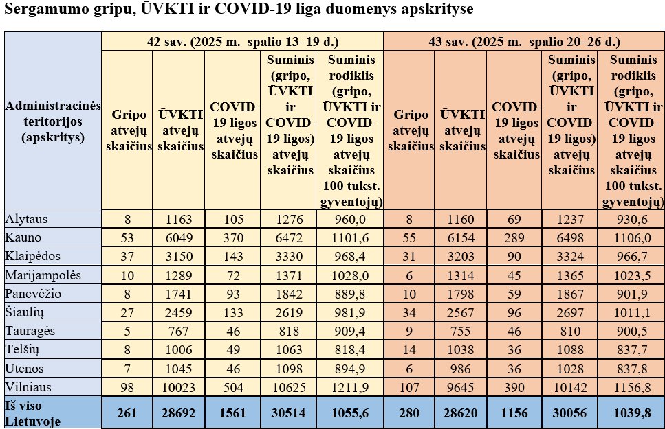 Praėjusią (43-ąją) savaitę Lietuvoje dėl gripo į ligonines buvo paguldyti 4 asmenys, dėl COVID-19 ligos – 50 asmenų. Nuo gripo mirties atvejų nefiksuota, nuo COVID-19 ligos – 5 mirties atvejai. Visi asmenys priklausė vyresnių nei 65 metų amžiaus grupei, neskiepyti ir turėjo lėtinių ligų.