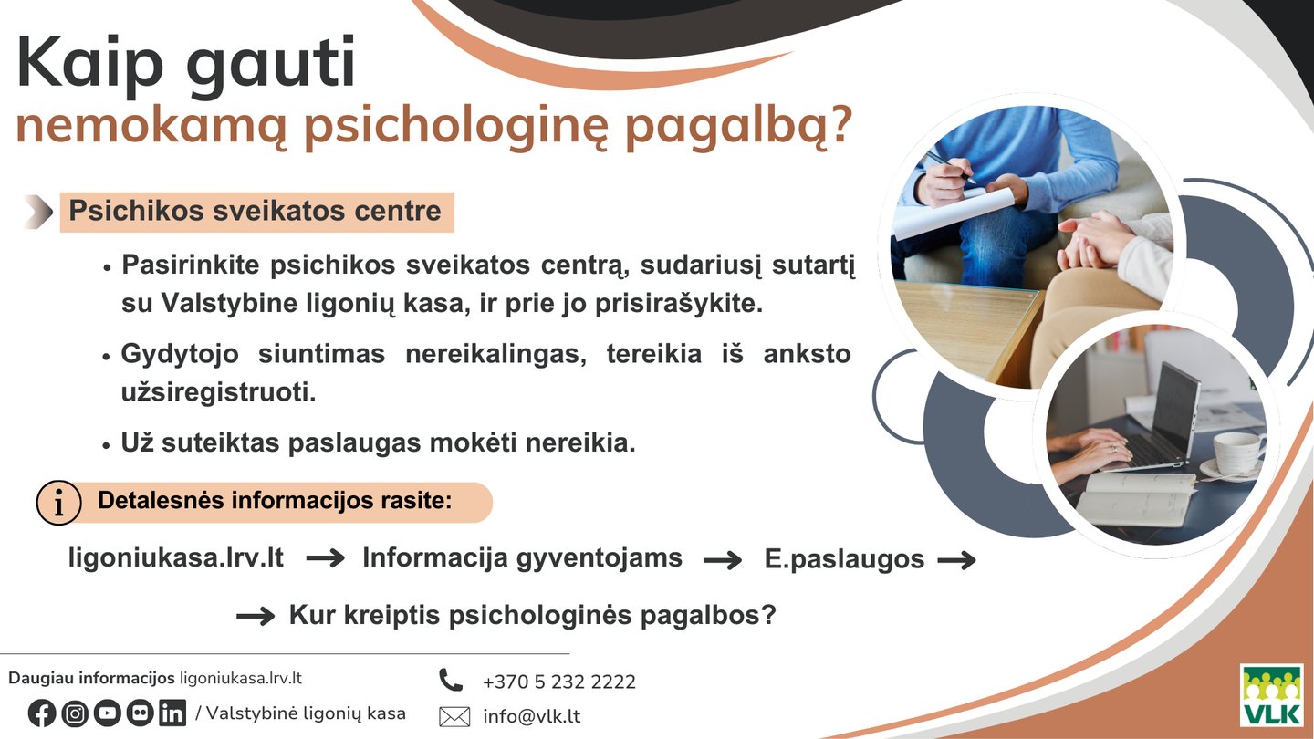 Ligonių kasa primena, kad skubią psichologinę ar psichiatrinę pagalbą psichikos sveikatos centruose galima gauti be eilės. Psichikos sveikatos centrų ne darbo laiku pagalbos galima kreiptis nemokamais telefono numeriais, internetu ar pasirinktose gydymo įstaigose. Informacija apie tai skelbiama: