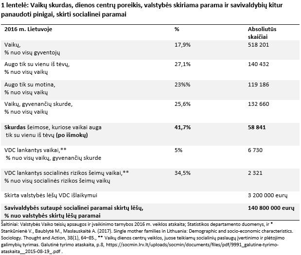 Tiesa, ministerija jau seniai deklaruoja remianti vaikų dienos centrus, tačiau ši parama yra daugiau nei 40 kartų mažesnė (2017 m. – net 44 kartus) nei savivaldybių sutaupomos lėšos, skirtos nepasiturinčių gyventojų socialinei paramai. Nacionalinės valdžios vaidmuo čia yra esminis. Valstybinių institucijų kompetencija apima gebėjimą pamatyti, kas vyksta Lietuvoje ir sustyguoti sistemą taip, kad nebūtų didinama socialinė atskirtis, o lėšos, skirtos socialinei paramai, nebūtų naudojamos kitiems tikslams.