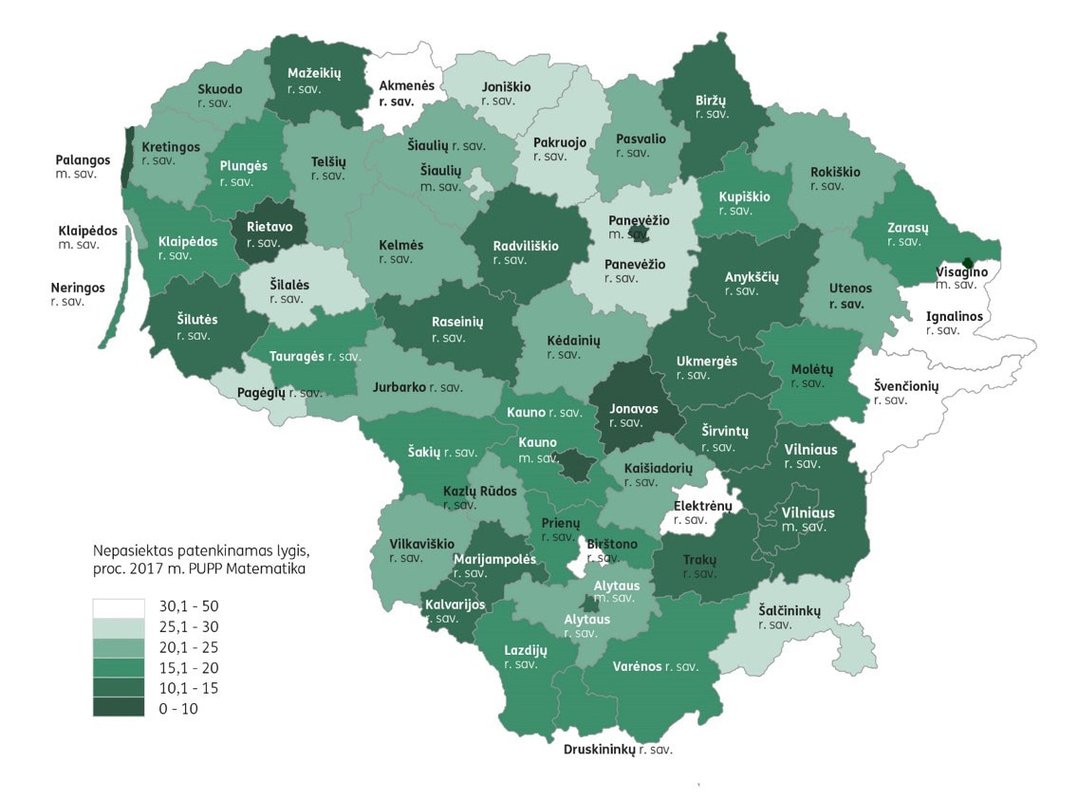 Geriausiais matematikos rezultatais pasižymėjo Kauno ir Panevėžio miestų, Visagino, Palangos, Rietavo, Jonavos rajono dešimtokai – šiose savivaldybėse patenkinamo lygmens nepasiekė ne daugiau kaip 10 proc. mokinių.