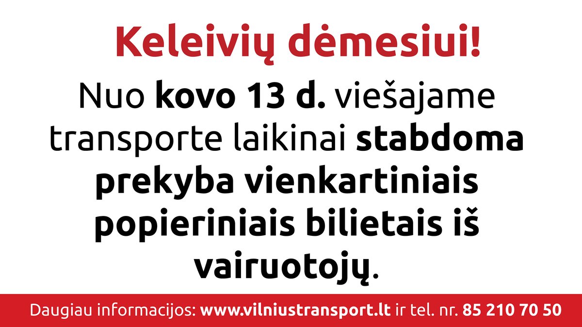 Autobusai ir troleibusai kursuos, tačiau bus dažniau dezinfekuojami, vėdinami. Nuo kovo 13 d. viešajame transporte laikinai stabdoma prekyba vienkartiniais bilietais iš vairuotojų. Pasirūpinkite bilietais iš anksto m.Ticket, Trafi, pildykite Vilniečio kortelę. Taip pat nuo kovo 13 d. mieste nekursuos naktiniai autobusai. Keleivių į viešąjį transportą prašome lipti ne per priekines duris, laikytis atstumo vienas nuo kito ir atsižvelgti į kitas Vilniaus visuomenės sveikatos biuras specialistų ir Vilniaus miesto savivaldybė rekomendacijas“, – rašoma pranešime.