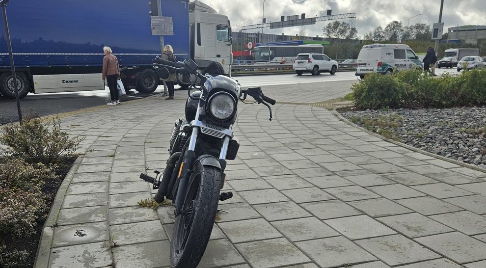 Policijos pareigūnai motociklininkui surašė protokolą dėl vairavimo neturint teisės vairuoti. Sunkvežimio vairuotojas sakė, kad nepatyrė žalos.