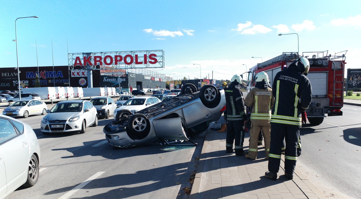 Penktadienį Vilniuje prie pat prekybos ir pramogų centro „Akropolis“ susidūrė dvi transporto priemonės, vienas automobilis apvirto ant stogo, taip pat prireikė medikų pagalbos.