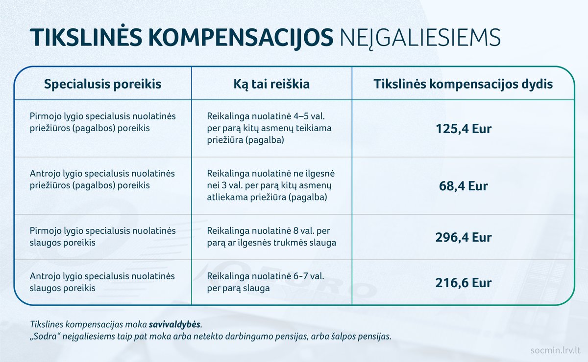 Neįgalumo ir darbingumo nustatymo tarnybai (NDNT) įvertinus suaugusio žmogaus ar vaiko specialiuosius poreikius, paskiriamos ir mokamos tiksinės kompensacijos. Tikslines kompensacijas moka savivaldybės.