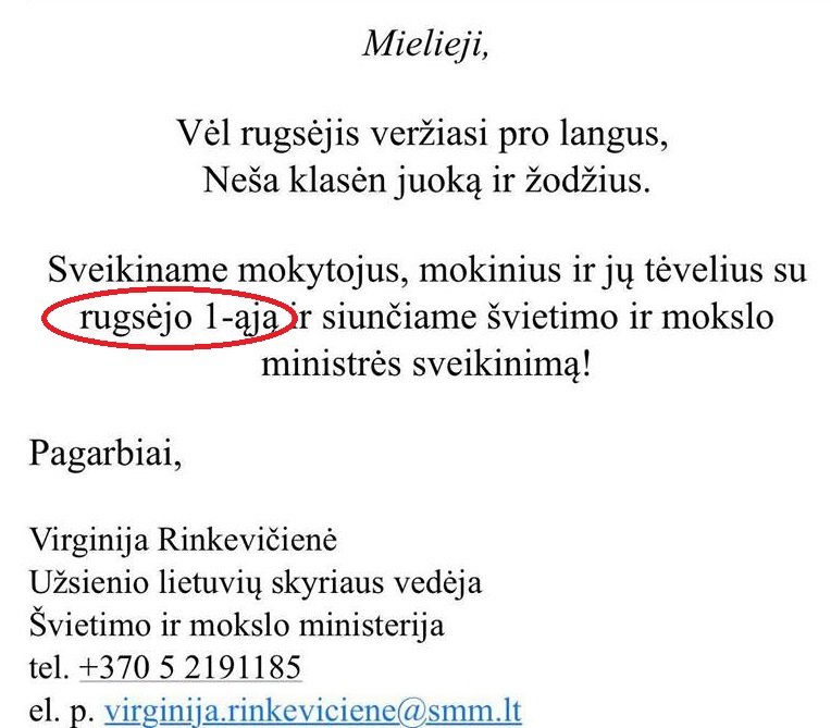 Užuot pasveikinusi moksleivius su rugsėjo 1-ąja, Užsienio lietuvių skyriaus vedėja Virginija Rinkevičienė savo sveikinime rašo: „Sveikiname mokytojus, mokinius ir jų tėvelius su rugsėjo 1-ąją“.
