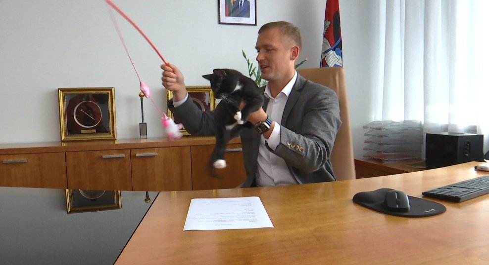 Savivaldybės vadovas sako, katinas šmirinėja po savivaldybę, bet nuo darbų neatitraukia, dar ir padeda dažnam atsipalaiduoti.