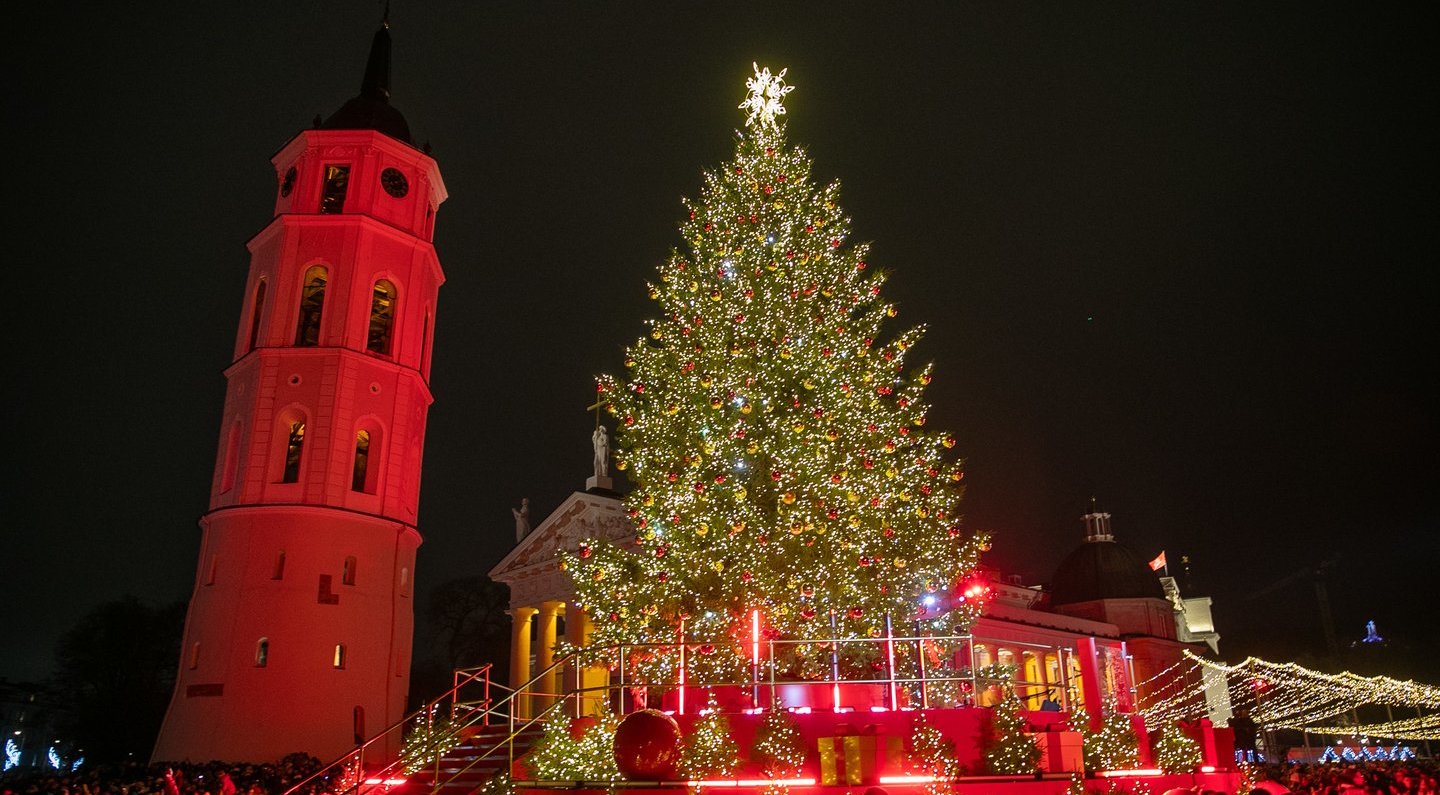 Šeštadienio vakarą sostinės Katedros aikštėje įžiebta pagrindinė Vilniaus Kalėdų eglė. Natūraliam 16 m aukščio medžiui šiemet parinktas klasikinis įvaizdis – jį puošia raudonos ir auksinės spalvų burbulai bei supa pakyla, leidžianti eglutę apžiūrėti iš arčiau.