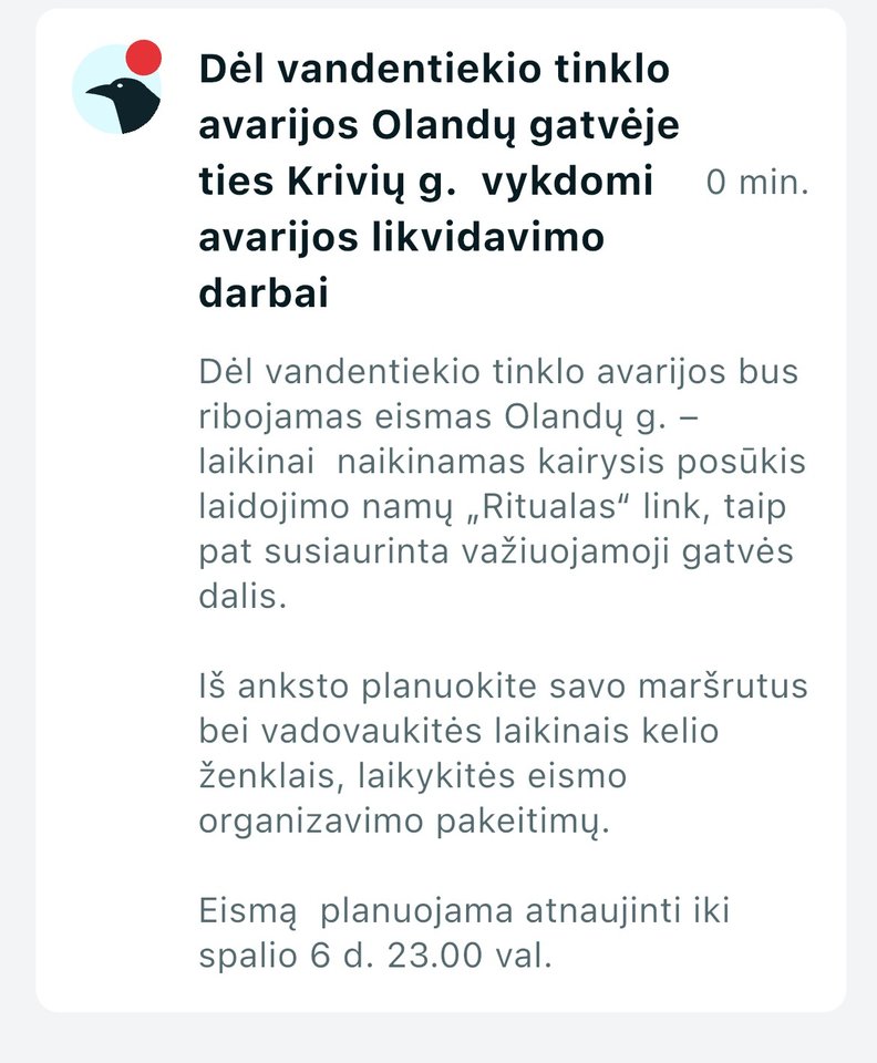 Kaip pranešama Vilniaus miesto savivaldybės programėlėje „Kovas“, dėl įvykio bus ribojamas eismas Olandų g. – laikinai naikinamas kairysis posūkis laidojimo namų „Ritualas“ link, taip pat susiaurinta važiuojamoji gatvės dalis.