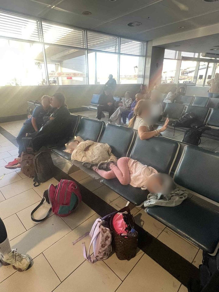 Mažesni lėktuvai jau pakilo, o mūsų didysis vis dar stovi vietoje. Informacijos, kada išvyksime namo, niekas nesuteikia. Vaikai visą naktį miegojo ant žemės.