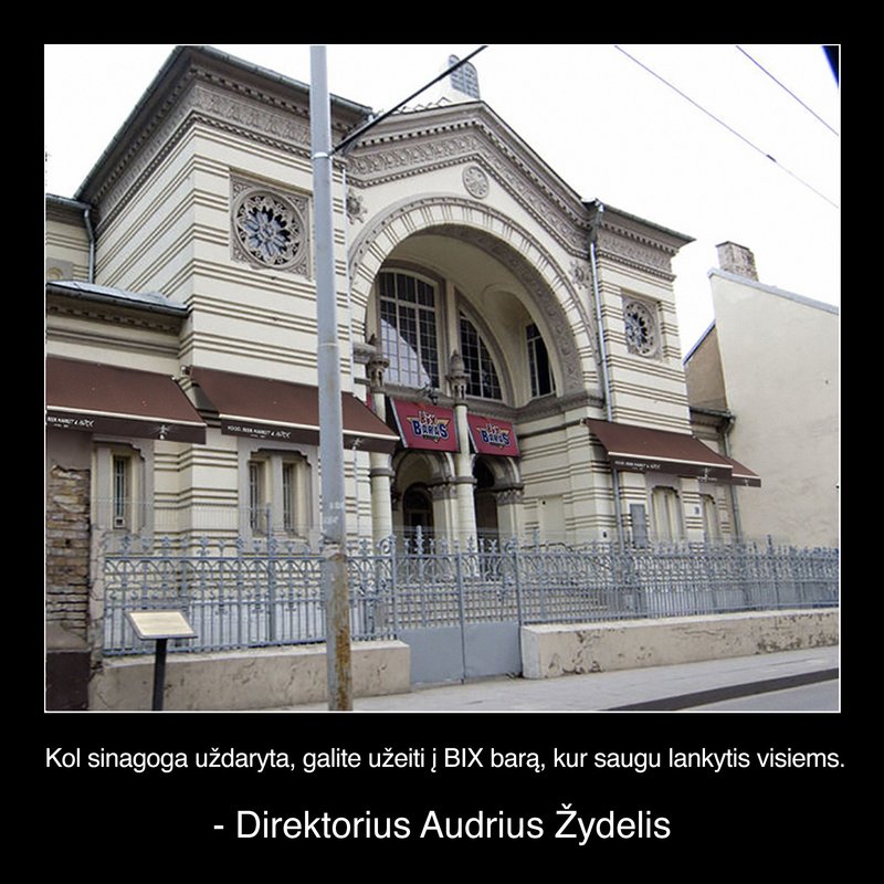 Ironišką paveiksliuką su savo direktoriaus Audriaus Žydelio citata feisbuke publikavo vienas seniausių sostinės barų „Bix Baras“, reaguodamas į Lietuvos žydų bendruomenės sprendimą tuo metu uždaryti Vilniaus choralinę sinagogą.
