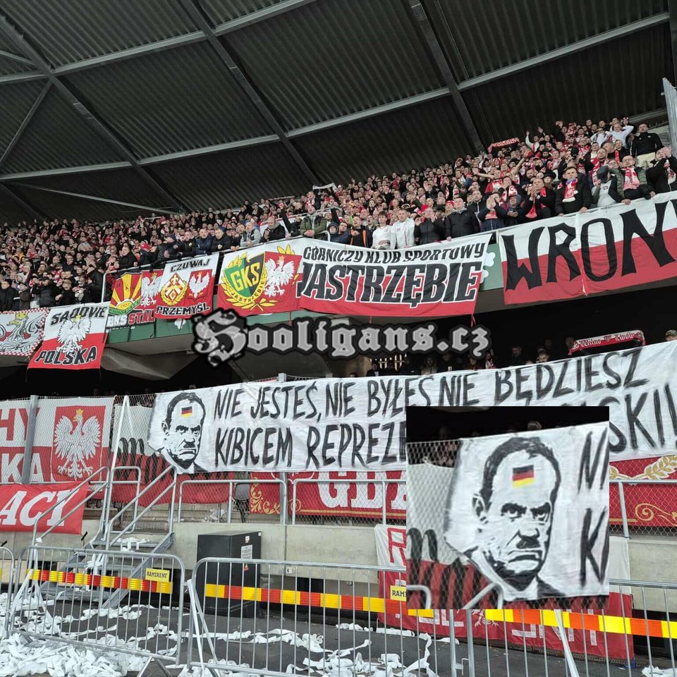 Viename iš plakatų Lenkijos premjeras pavaizduotas su Vokietijos vėliava ant kaktos, o šalia – užrašas: „Tu nesi, niekada nebuvai ir niekada nebūsi Lenkijos rinktinės sirgalius“.