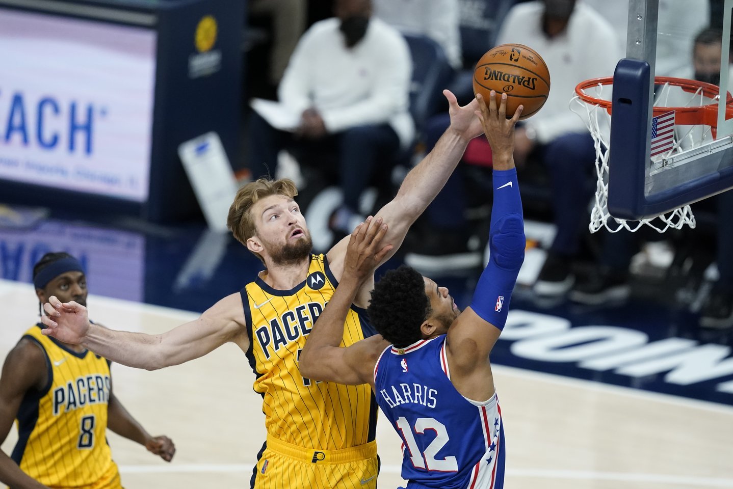 Beveik viso mačo metu atsilikusi Indianos ekipa tik trečio kėlinio pabaigoje išsiveržė į priekį 75:72, bet tada „76ers“ atsakė spurtu 8:0 ir susigrąžino iniciatyvą.