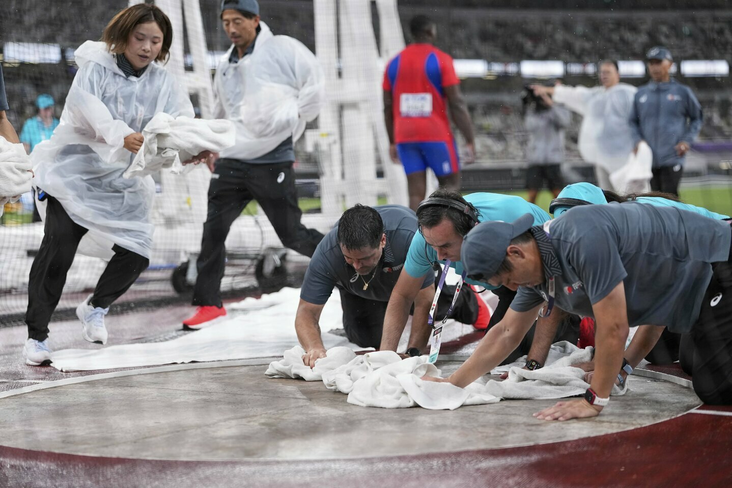 Lijo taip stipriai, kad antrasis į sektorių žengęs Matthew Denny slystelėjo ir varžybos buvo sustabdytos, o dalyviai patraukė į kolidorius po nacionalinio stadiono tribūnas.