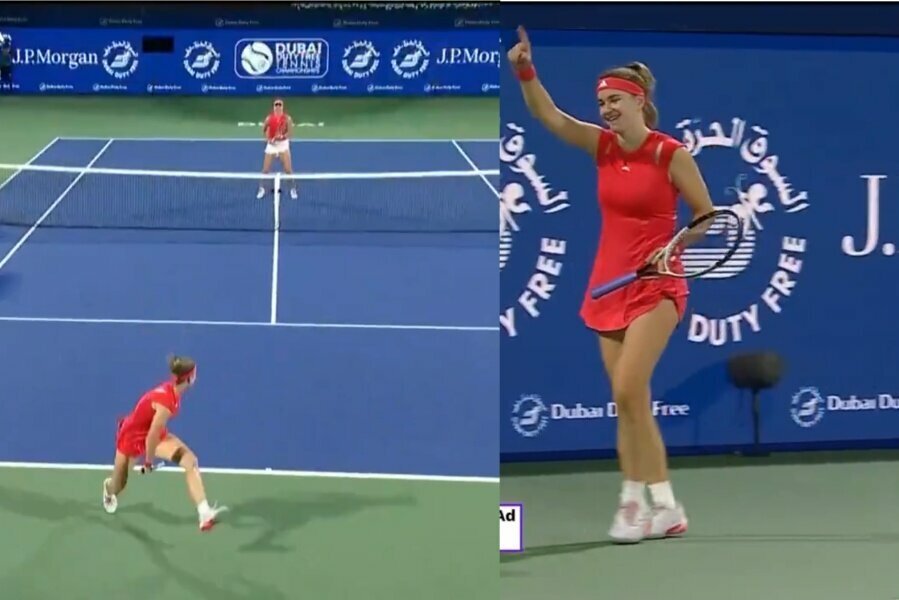 Beje, čekė šiame mače atliko reto grožio smūgį. Trečiojo seto penktajame geime K.Muchova tašką pelnė smūgiu tarp kojų.
