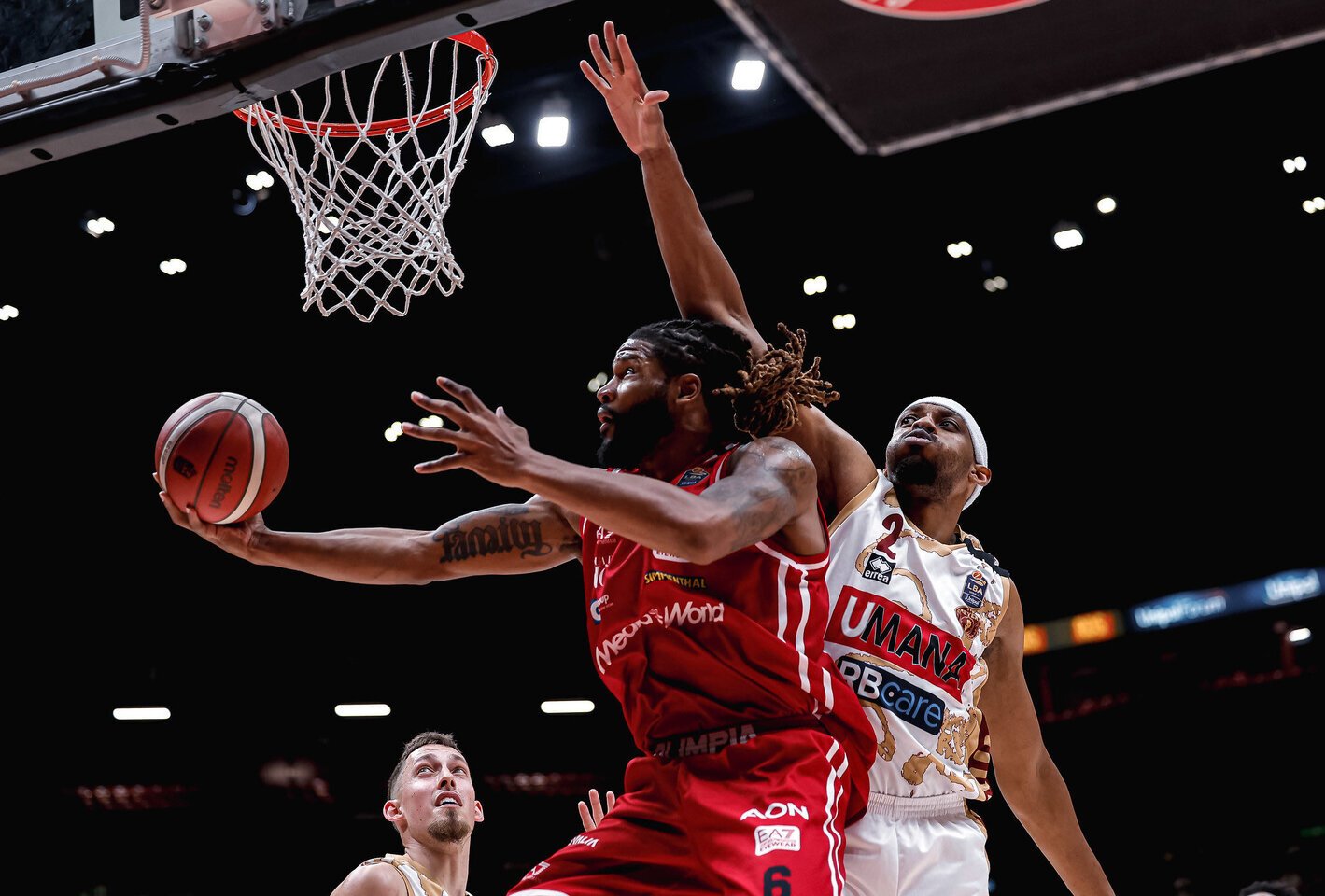 Milano klubas turėjo tris ryškius lyderius – po 23 taškus pelnė Devinas Bookeris (3/5 tritaškių), Armoni Brooksas (3/7 tritaškių, 7 atk. kam.) ir Shavonas Shieldsas (4 atk. kam., 5 rez. perd.). Nė vienas iš jų pagalbininkų nepasiekė dviženklės ribos.