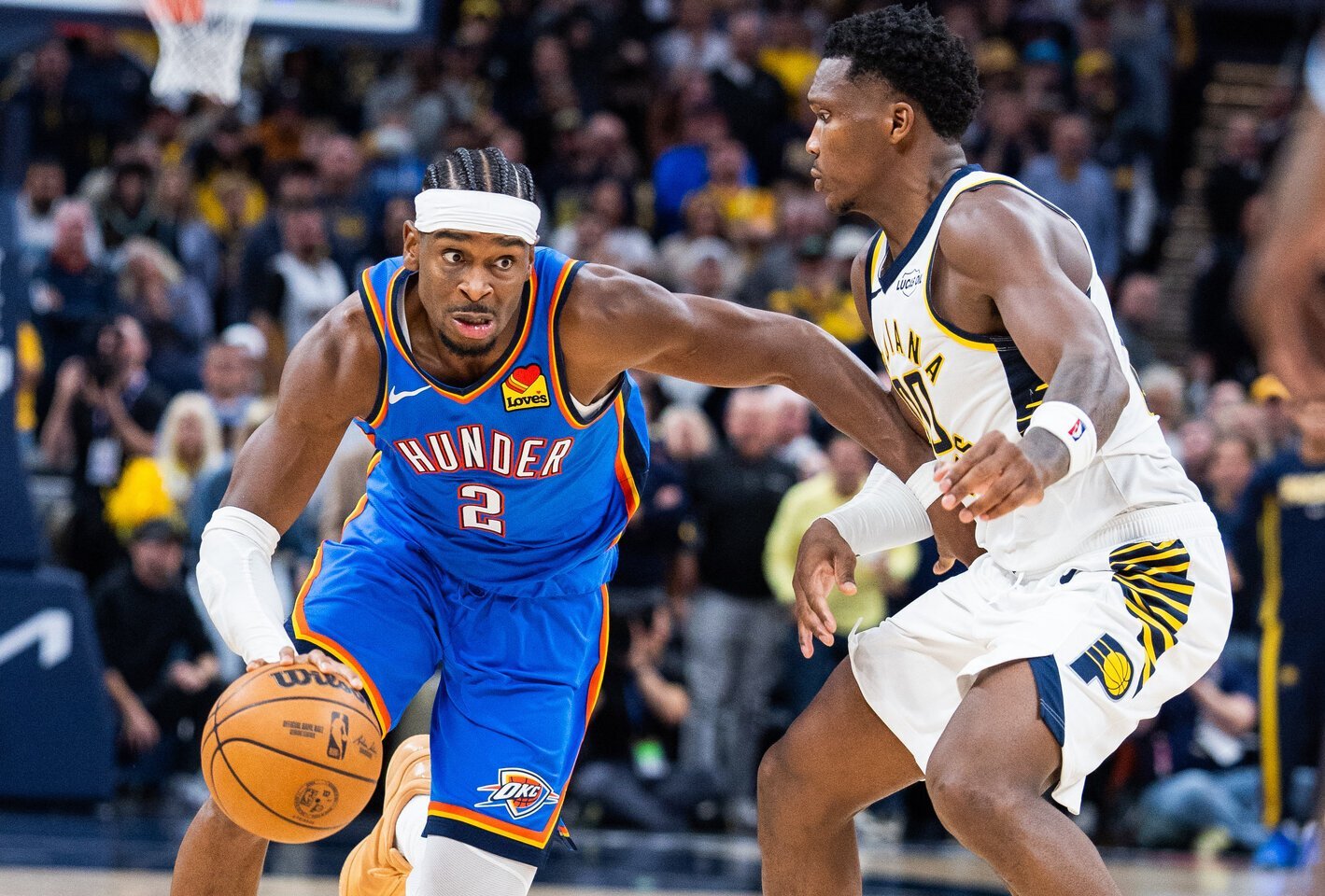 „Thunder“: Shai’us Gilgeousas-Alexanderis 55 (8 atk. kam., 5 rez. perd., 23/26 baud. met.), Ajay’us Mitchellas 26 (4 rez. perd.), Aaronas Wigginsas 23 (9 atk. kam., 5/9 tritaškių), Chetas Holmgrenas 15 (12 atk. kam., 0/6 tritaškių), Luguentzas Dortas 7 (8 atk. kam.).
