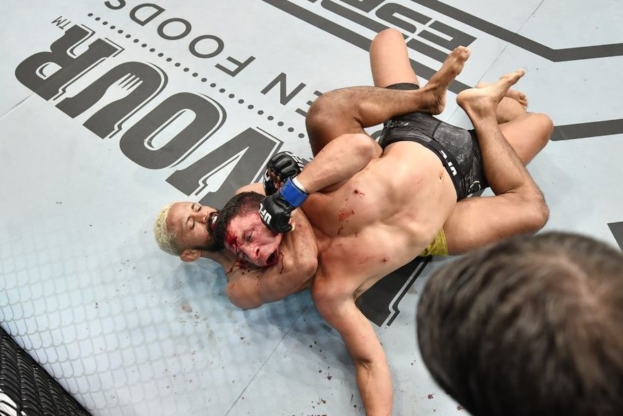 Deivesonas Figueiredo įveikė Josephą Benavidezą skausmingu veiksmu („rear-naked choke“) — Raundas 1, 4:48